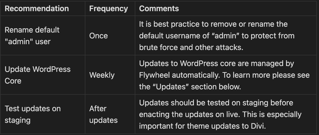 This analysis was meant to be a snapshot in time of the state of the website. Which includes important versions (WordPress, PHP, etc), the admin access path, and whether or not it has a staging site, SSL, or a CDN. It also includes a review of the error logs for anything that might need to be fixed.